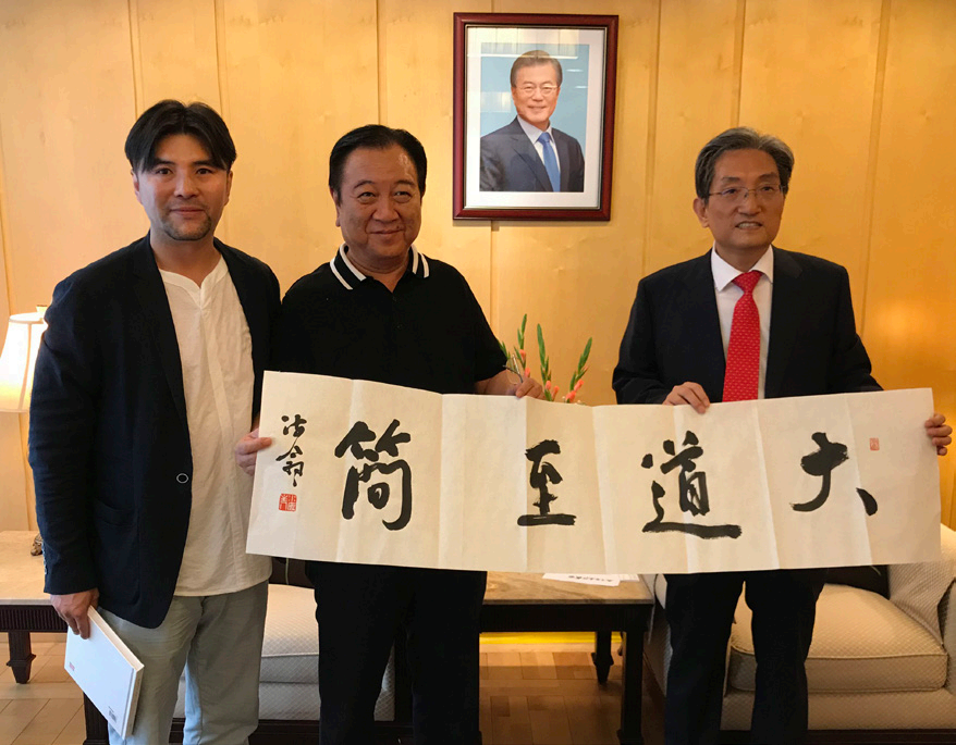 协会秘书长刘彤(左二)、会长姚佳(左一)赠送大韩民国驻华大使卢英敏(右一)海翁书法作品